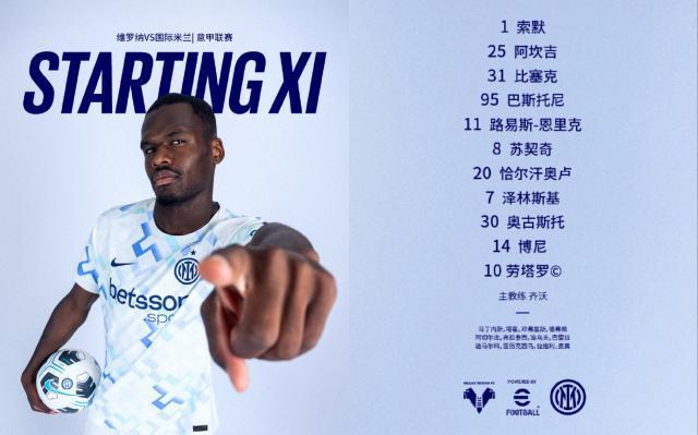 国际米兰阵容:佐默/阿坎吉、比塞克、巴斯托尼/路易斯·恩里克、苏契奇、恰尔汗奥卢、泽林斯基、奥古斯托/博尼、劳塔罗